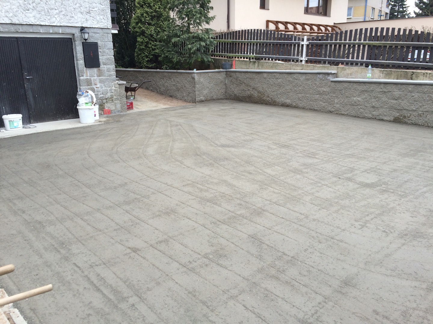 Revitalizace nádvoří, opěrné zdi z KB blok, kamenné schody, kanalizace, oplocení a vjezd.